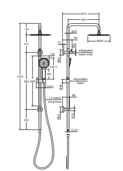 Upgrade your bathroom with the KAYA shower system in a luxurious PVD brushed copper finish, combining modern design with durable, high-quality materials. The solid brass rail features an integrated top water inlet and diverter, allowing smooth transition between the overhead shower and hand shower. The slider adjusts both the height and angle of the hand shower for personalized comfort, complemented by a 1.5-metre stainless steel hose for flexibility and convenience.