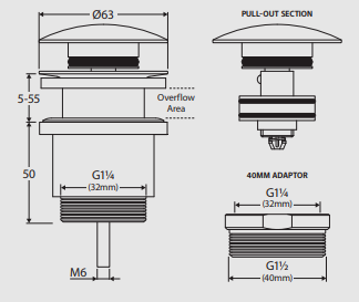 The entire top section pulls out for quick cleaning and drainage, while the convertible design allows it to be used with or without an overflow, easily adjusted by the centre screw. Suitable for 32mm or 40mm outlets (40mm adaptor included), this waste is both functional and refined, making it an excellent choice for bathrooms across Perth and regional WA.